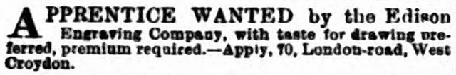 - Ward’s directories list the Edison Engraving Company at 70–72 London Road in 1900 and 1901, and at 70 London Road in 1902. (Note that 70 London Road was renumbered to 202 in the 1920s.) An advert for an apprentice on page 4 of the 7 October 1899 Croydon Chronicle (reproduced here) gives an address of 70 London Road. Quotations and information about receivership are taken from an advert on the front page of the 14 June 1902 Croydon Chronicle. Note that “goodwill” here refers to the reputation of the firm; purchasing the goodwill of a business meant being able to trade as its recognised successor.