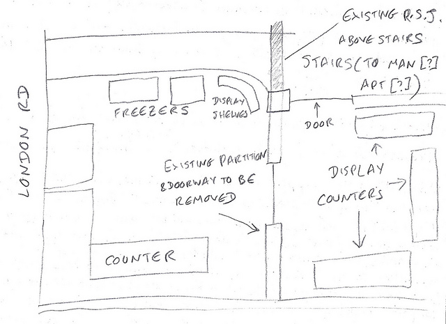 - “R.S.J.” stands for “rolled steel joist”, a structural beam with an H-shaped cross-section. “MAN APT” might stand for “main apartment”; that is, the living accommodation on the upper floors. As shown in the first image in this article, there’s still an external door to the left of the shopfront today, presumably leading to this accommodation via the corridor shown at the top of the diagram.