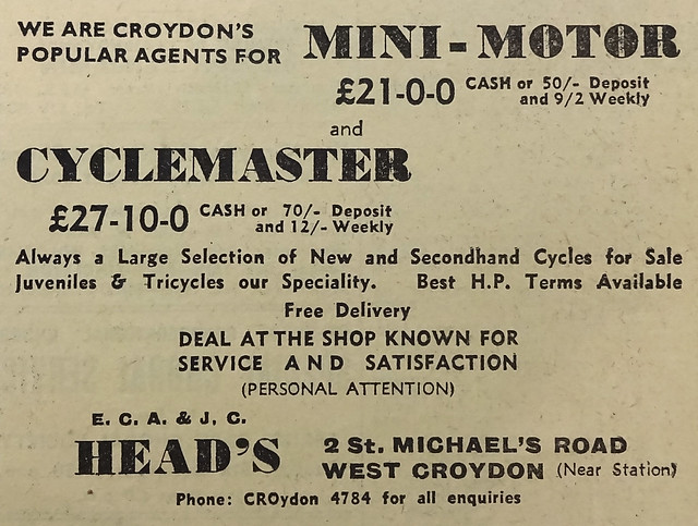 - An advert on page 11 of the 15 April 1960 Norwood News gives a list of local agents for the Raleigh Mark 2 moped, including Heads Cycles at 410 London Road, Mitcham. As noted in an earlier footnote, phone books list Heads at 208 London Road up to and including the 1985 Croydon edition.