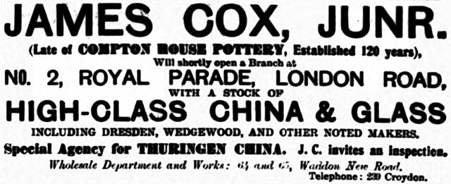 - Ward’s 1906 directory lists James Cox Junior, glass & china stores. An advert on page 10 of the 16 September 1905 Croydon Guardian states that James’ shop is now open, and refers to it as the “Royal Parade Glass & China Stores”. Quotations are taken from an article on page 10 of the 26 August 1905 Croydon Guardian.