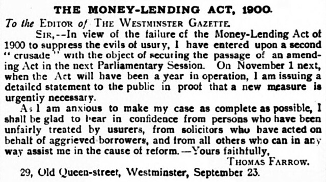 Despite his success in motivating the new Act, Thomas remained dissatisfied with the financial options available to those not rich enough to “obtain [credit] in abundance from Joint Stock Banks”. In September 1901, he wrote to the Westminster Gazette stating that due to “the failure of the Money-Lending Act of 1900 to suppress the evils of usury”, he had “entered upon a second ‘crusade’ with the object of securing the passage of an amending Act in the next Parliamentary Session”.[5]
