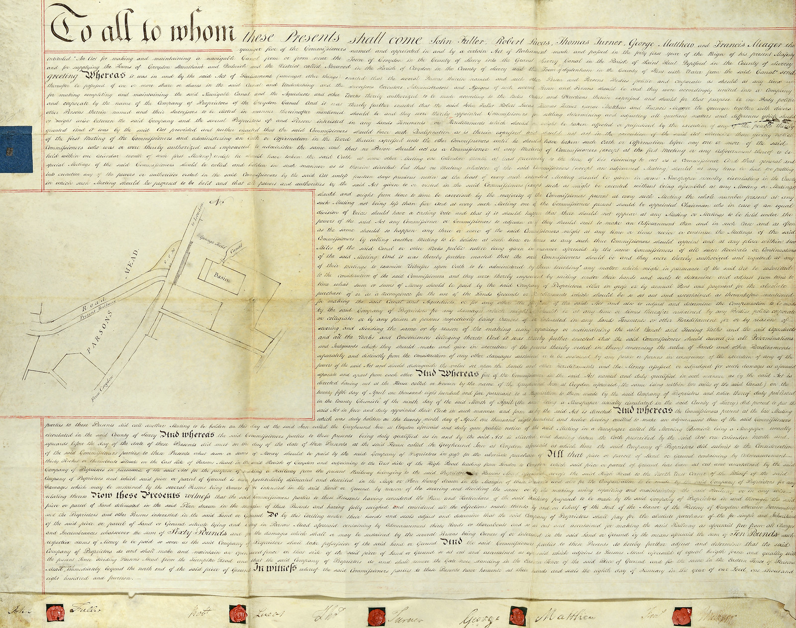 To all to whom these Presents shall come John Fuller, Robert Lucas, Thomas Turner, George Matthew and Francis Meager the younger five of the Commissioners named and appointed in and by a certain Act of Parliament made and passed in the forty first year of the Reign of his present Majesty intituled “An Act for making and maintaining a navigable Canal from or from near the Town of Croydon in the County of Surry [sic] into the Grand Surrey Canal in the Parish of Saint Paul Deptford in the County of Surrey and for supplying the Towns of Croydon Streatham and Dulwich and the District called Norwood in the Parish of Croydon in the County of Surry [sic] and the Town of Sydenham in the County of Kent with Water from the said Canal” send greeting